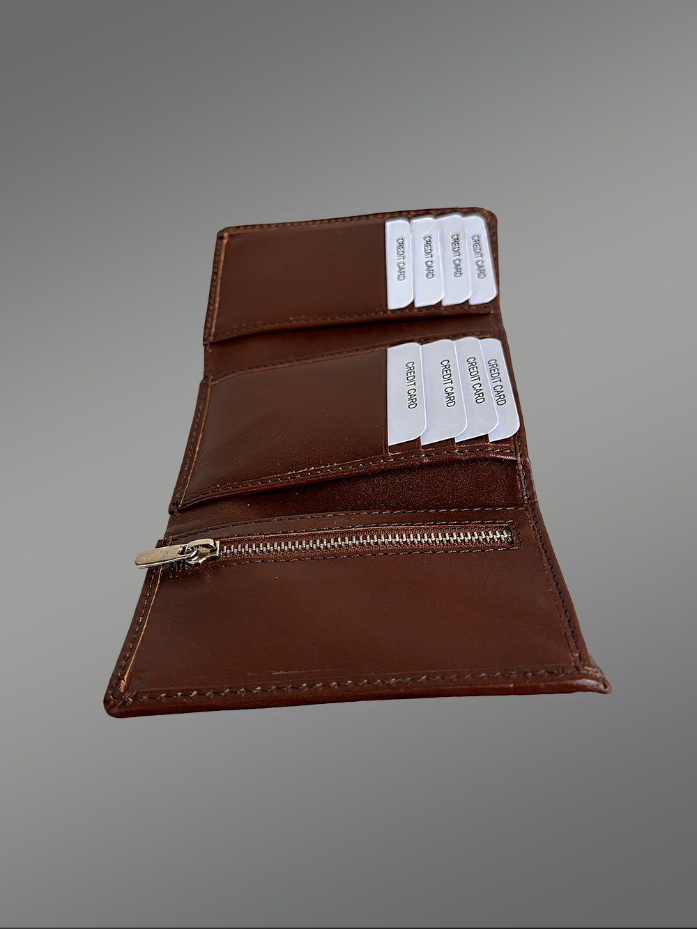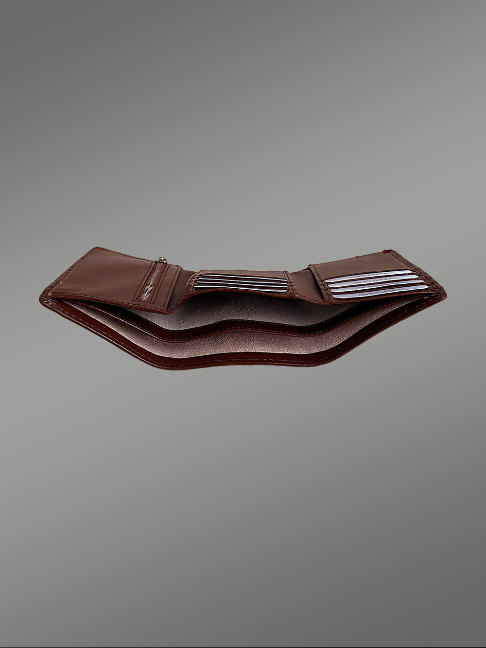 The right-hand side compartment of this wallet is designed with a metal zipper. Owing to the zip-up closure, one’s personal items receive more protection. Therefore, this compartment can be used to carry valuable objects. Furthermore, the metal zipper has chrome finish which guarantees longevity.