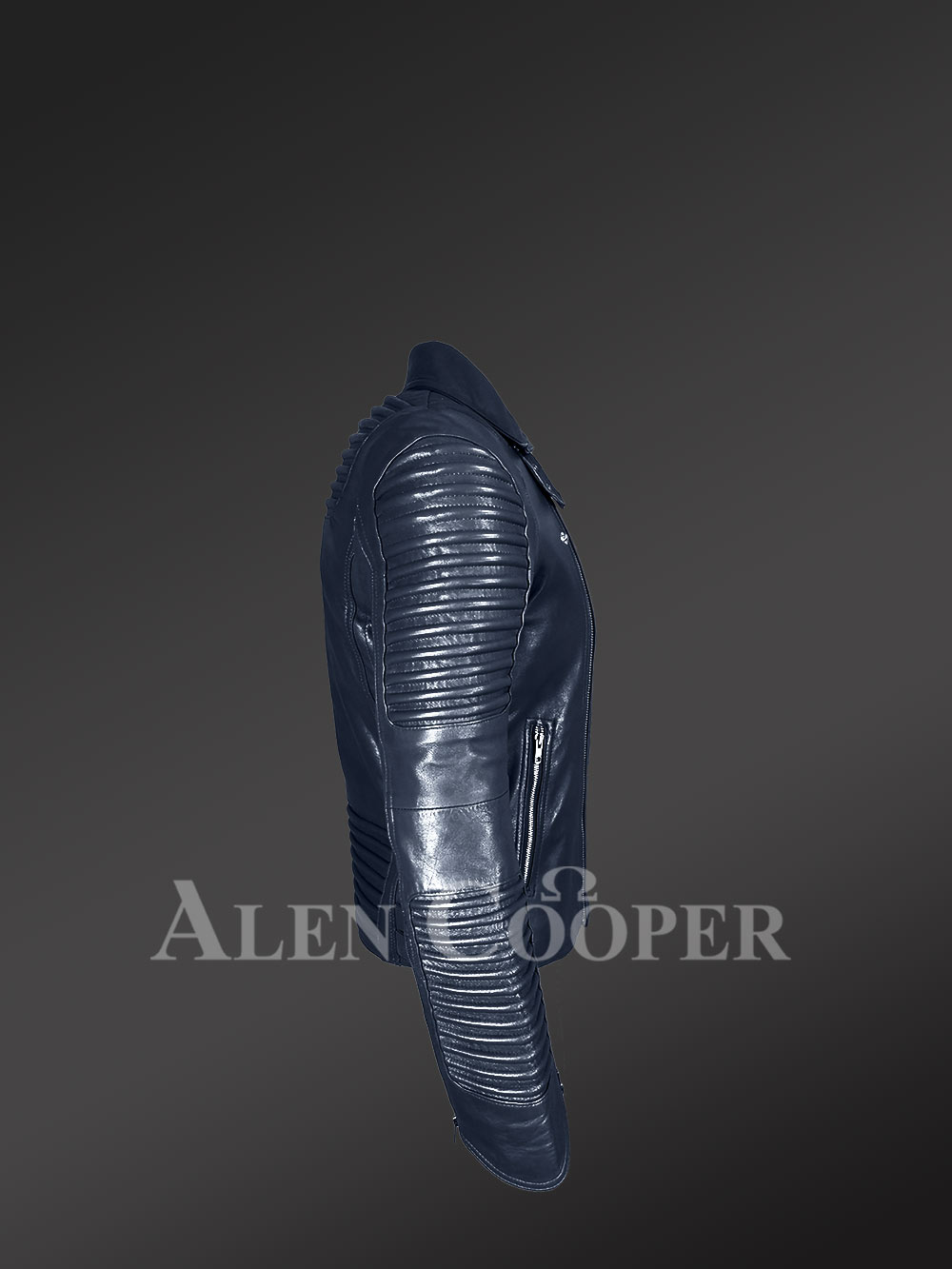 The waist-length jacket is crafted out of Italian Analine finished authentic Lamb leather. Its top-notch quality radiates shimmering shine. The original leather glaze is complimented by additional décor on prime parts of the biker wear. The captivating features are highly mesmerizing and fabulous, thereby preserving the semi-formal and standardized appeal.
