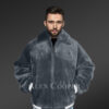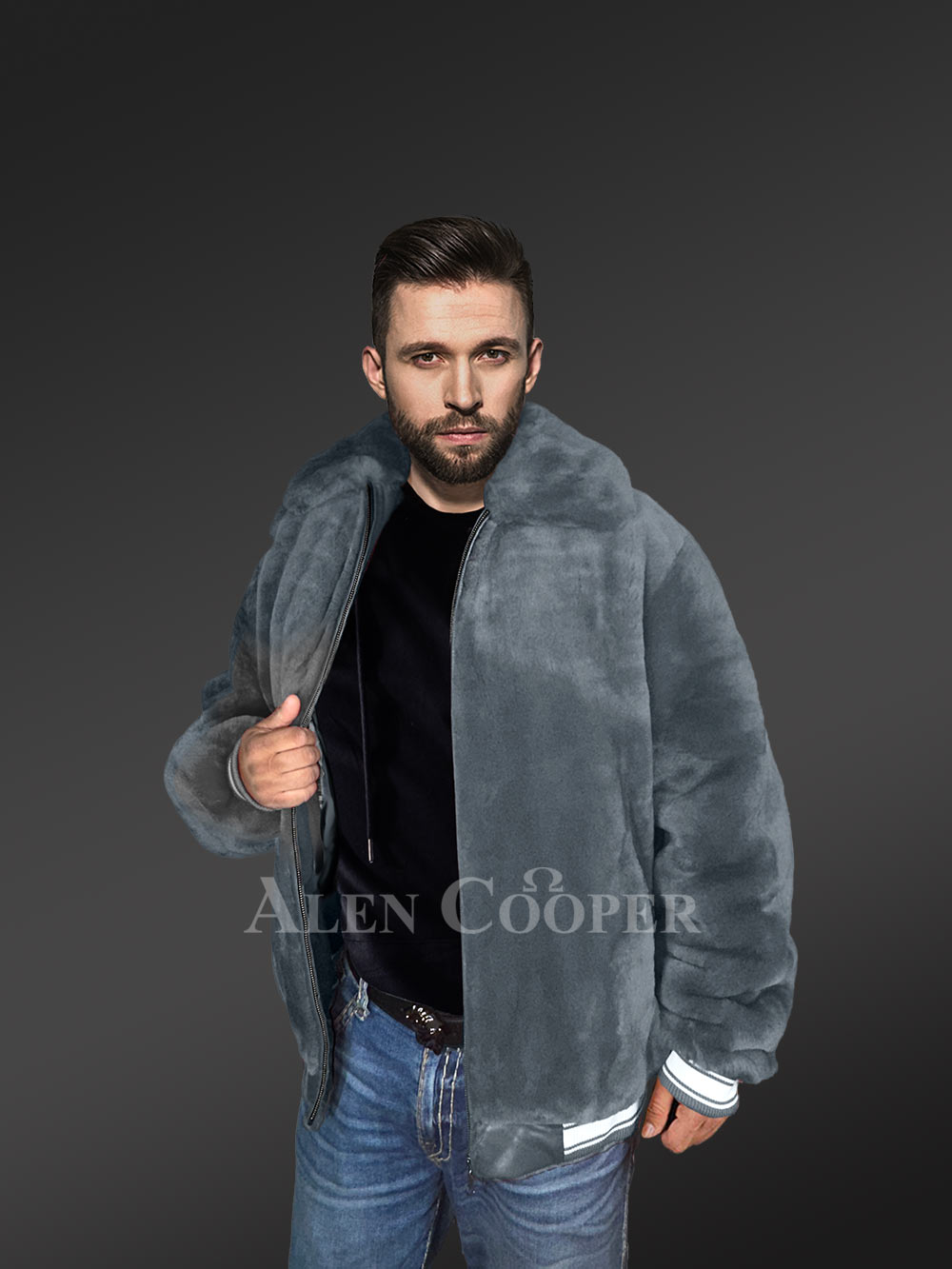 This classy varsity bomber in sheepskin mouton can be a befitting outfit for both festivities and formal affairs. This winter wear features a formal look because of the dark grey shade. On the other hand, it exudes the pleasant shine of the original pelts of sheepskin wool used in the body and collar.