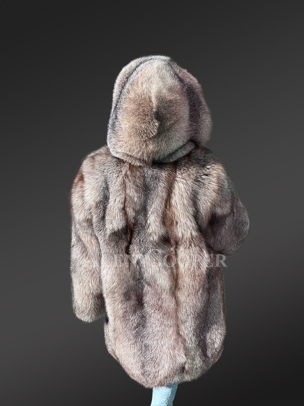 This piece is a Women Fox Fur Long Coat. In a long coat, the length can vary from knee-length to nearly floor-length but typically is a knee-length coat. This type of coat is comfortable during cold seasons. This hooded coat covers the head during chilled weather for warmth. The full sleeves cover the hand to provide a cosy feel.