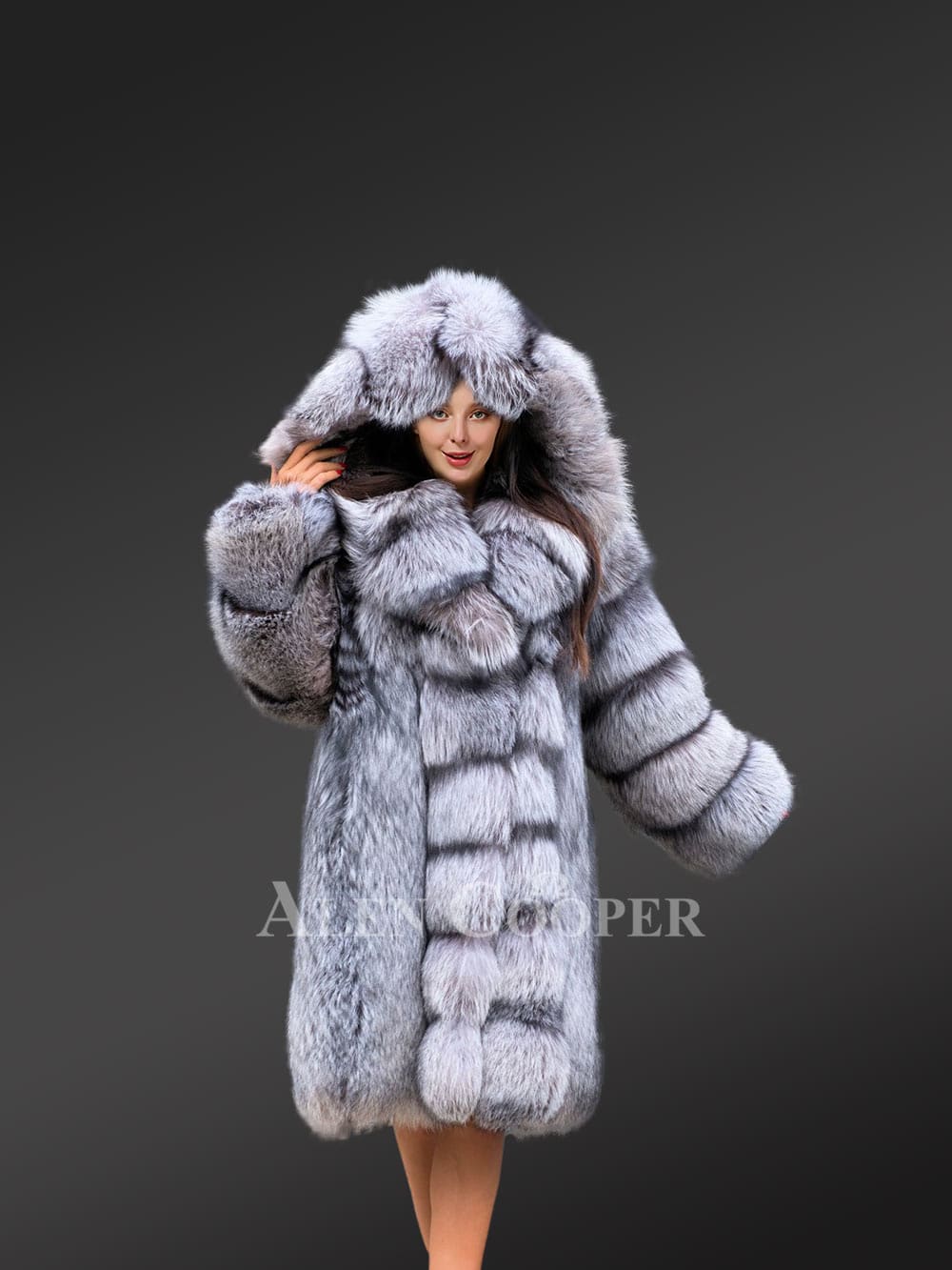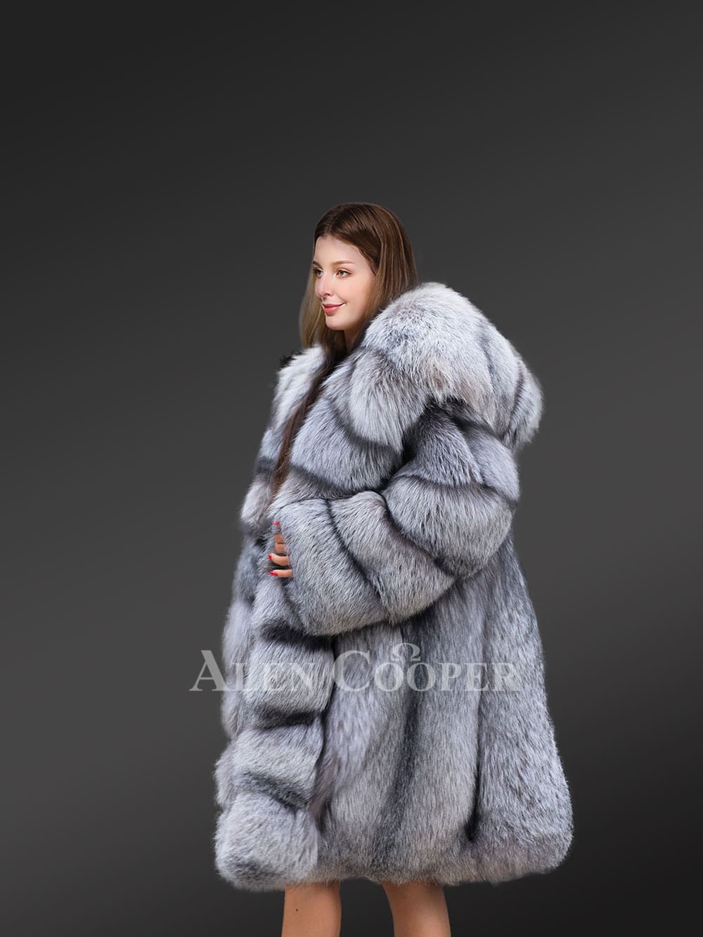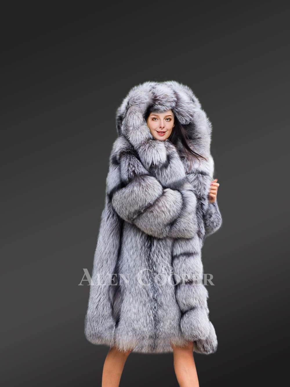 A fusion of grayish silver and black shades heightens the chic looks of this women long coat in fox fur. These are natural shades of Silver Fox Fur. It has been finely processed. Because of its smoothness, this winter wear is extremely comfortable to wear. The full-skinned fox fur gives it a voluminous look. The fluffy hair and dense down also give protection from the biting cold of winter.