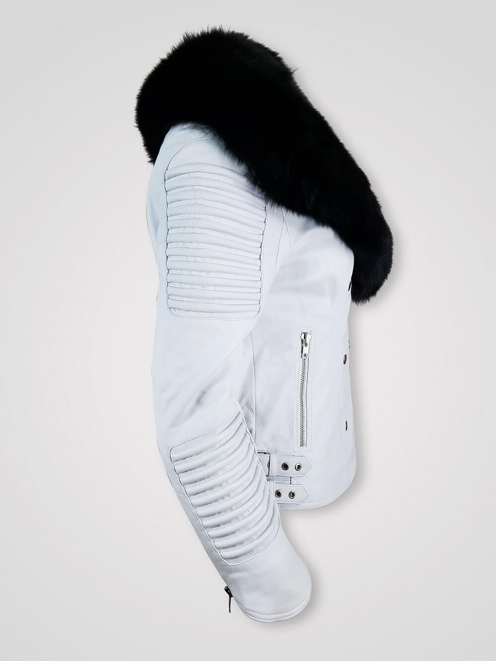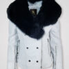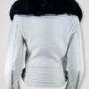 This posh biker jacket is designed with a detachable collar of fox fur. This isn’t just a glamorizing feature. To emphasize, the shawl-style lapel covers the neck, shoulders and chest in warmth of fox fur. Furthermore, the furry lapel dyed in black looks striking in contrast to the pristine white leather.