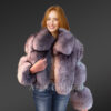 This deluxe womens crop coat in fox fur and lamb leather sports a classy look in a pleasant shade of purple. The variation in design of the back and front sides is undeniably the specialty of this coat. To emphasize, the front side features full skin pelts of fox fur. Whereas wide bands of fur stylize the back as well as long sleeves in an alluring pattern.