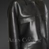 This trendy leather jacket with long sleeves is certainly the perfect companion for this classy leather skirt. The buttons beautifying the front part keep one warm by preventing the loss of body heat or keeping the cold breeze at bay. The shirt style collar certainly adds to the charm of this outfit. The flap pockets are useful for carrying essentials when going out looking sharp and chic.