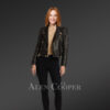 Alen Cooper snugly beautifies the women’s fashion wardrobe with its stylish range of crop-style leather jackets. One such trendy piece, womens cropped moto leather jacket, suits both chilly nights and sunny days with its comforting feel. This plush outfit complements the feminine form with its refined composition and voguish design. Finest quality lamb leather with Italian Aniline finish creates a premium labeled snazzy outerwear. Genuine lambskin leather furnishes a relaxing thermal breathability for extended hours during a ride. In addition, the jacket’s inner silky satin lining conveys a soothing touch to the wearer’s skin.