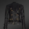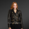 This womens cropped moto leather jacket accessorized with chrome-finished golden metallic zippers, takes the aesthetics slightly higher. This double-breasted jacket adorned with rose gold buttons and an asymmetrical zipper closure creates a stellar look for women. Leather epaulet can be noticed on each side of the shoulder. Spacious zippered spacious pockets in horizontal pattern feature on either side of the waistline. The most striking feature of this gorgeous moto jacket remains its detachable belt at the hemline. This chunky belt with buckled design offers a spectacular look with a snug fit to the wearer’s body. This ritzy outerwear perfectly fits with stylish bottom wear like leather pants, linen trousers, denim, or even mini or long skirts.