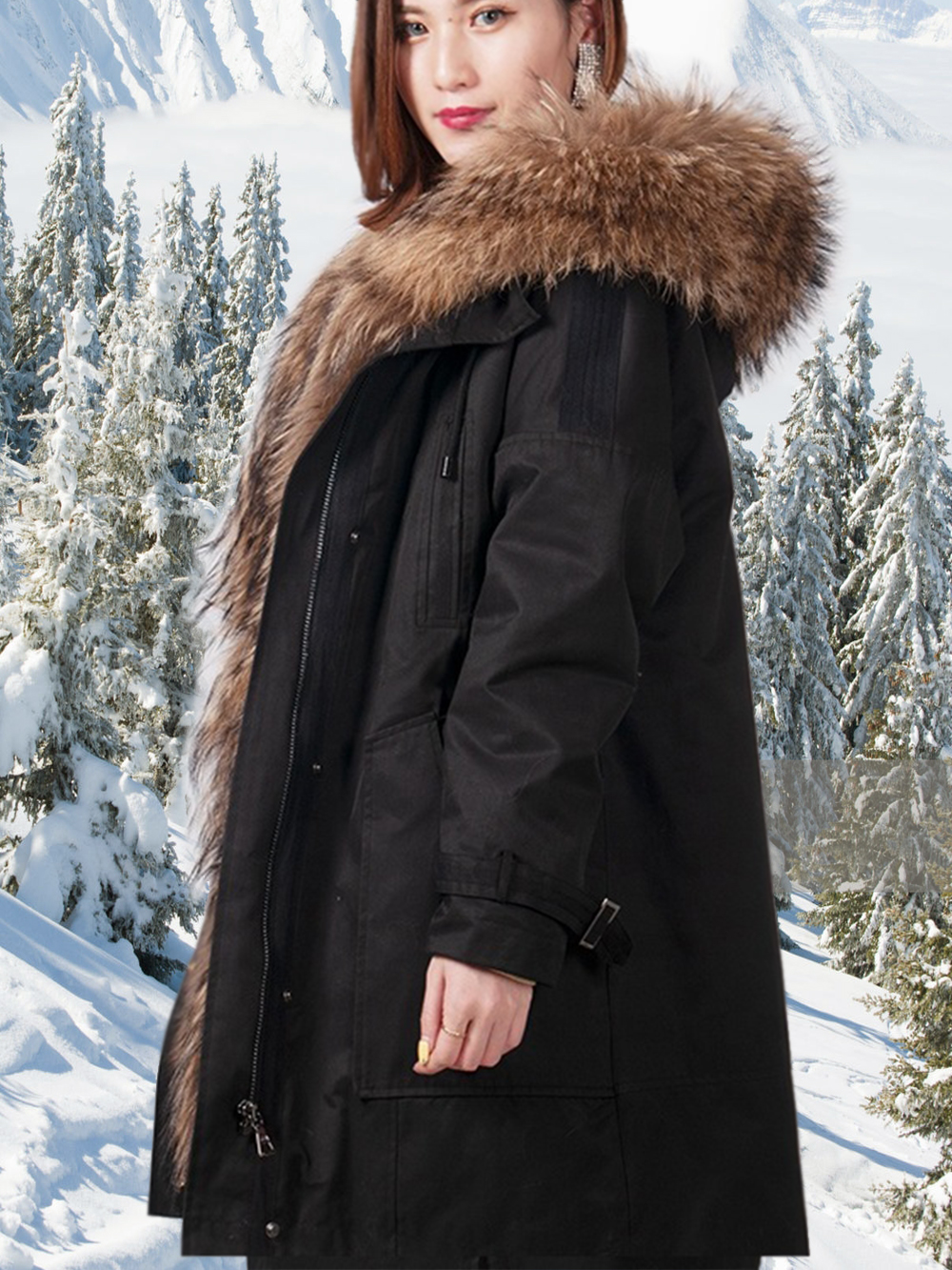 Women’s Elegant Brown Parka with Soft Raccoon Fur Hood and Long Collar