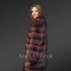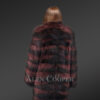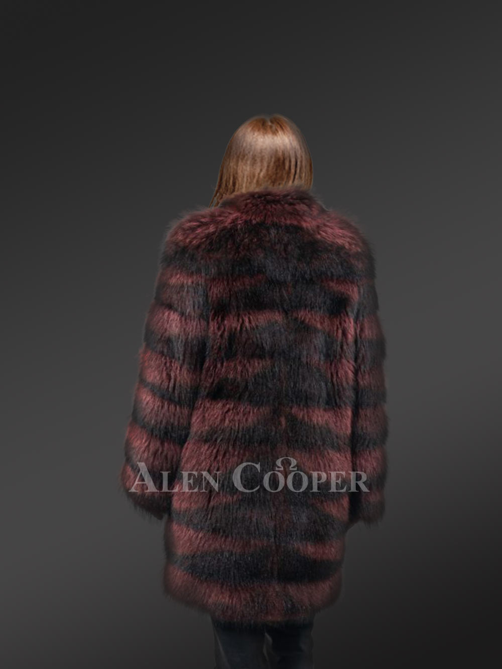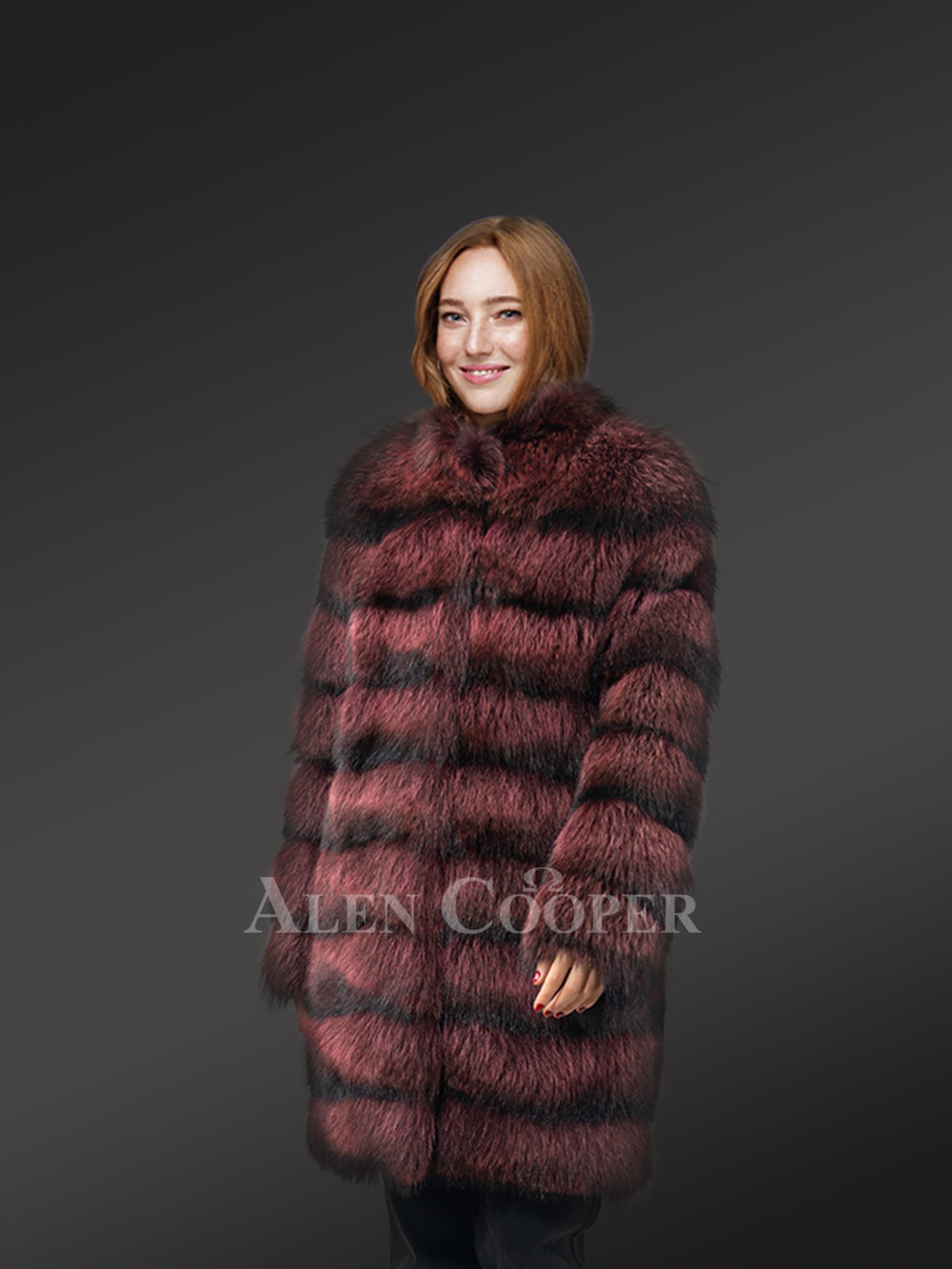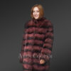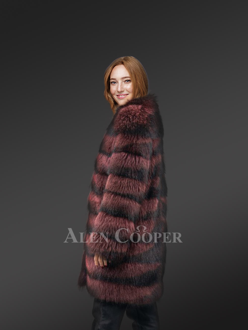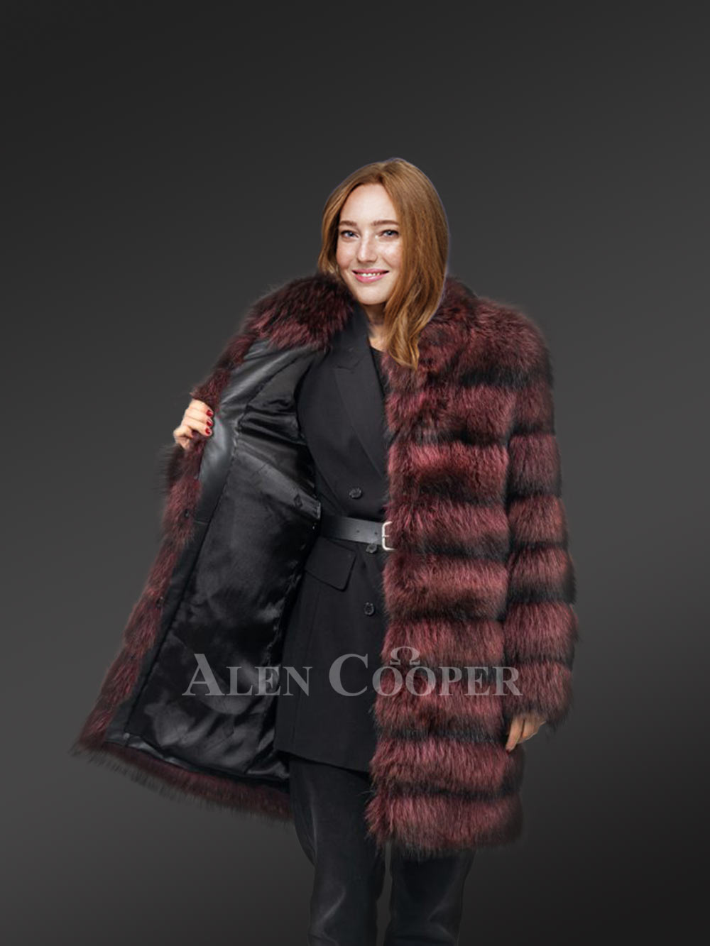 This fashionable womens long raccoon coat can instantly glamorize the looks of any woman. Without a doubt, it looks ravishing in the playful combination of passionate wine and bold black shades. It has been handcrafted by gifted artisans using the finest quality raccoon fur. Without a doubt, the aesthetic appeal of this deluxe outfit results from the tiered arrangement of pelts all over the body.