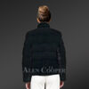 This waist-length coat is an agreeable thermal fit in the winter for any occasion. This chic outerwear has a stunning turtle neck therein providing an appropriate shielding against the piercing wind. The thick stand-up collar style exhibits meticulousness in designing the neck segment of this apparel. The slant-styled pockets on both sides of the mink coat make sure hands remain warm against the chilly air. The pitch-black color body in a sequined paragraph-styled body thus creates an exuberant tone for this gorgeous coat. The horizontal pelt lines contribute towards an exuberant tone to the gleaming texture of the coat. The long sleeves of the coat also display a neat parallel pattern similar to the fully lined texture of the body.