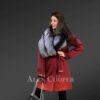 This magnificent woolen coat for women with fox fur lapel can instantly glamorize the looks of any woman. It indeed looks outstanding with a shawl style lapel of Silver fox fur. The blackish grey shade of the fur creates an appealing contrast with the red woolen body of the coat. It has a belt which accentuates the waist. One may tie it around the waist or may use the metal buckle to adjust the fit.