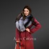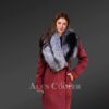 - Deluxe woolen coat with a wide shawl-style lapel of Silver fox fur looks exquisite in red color